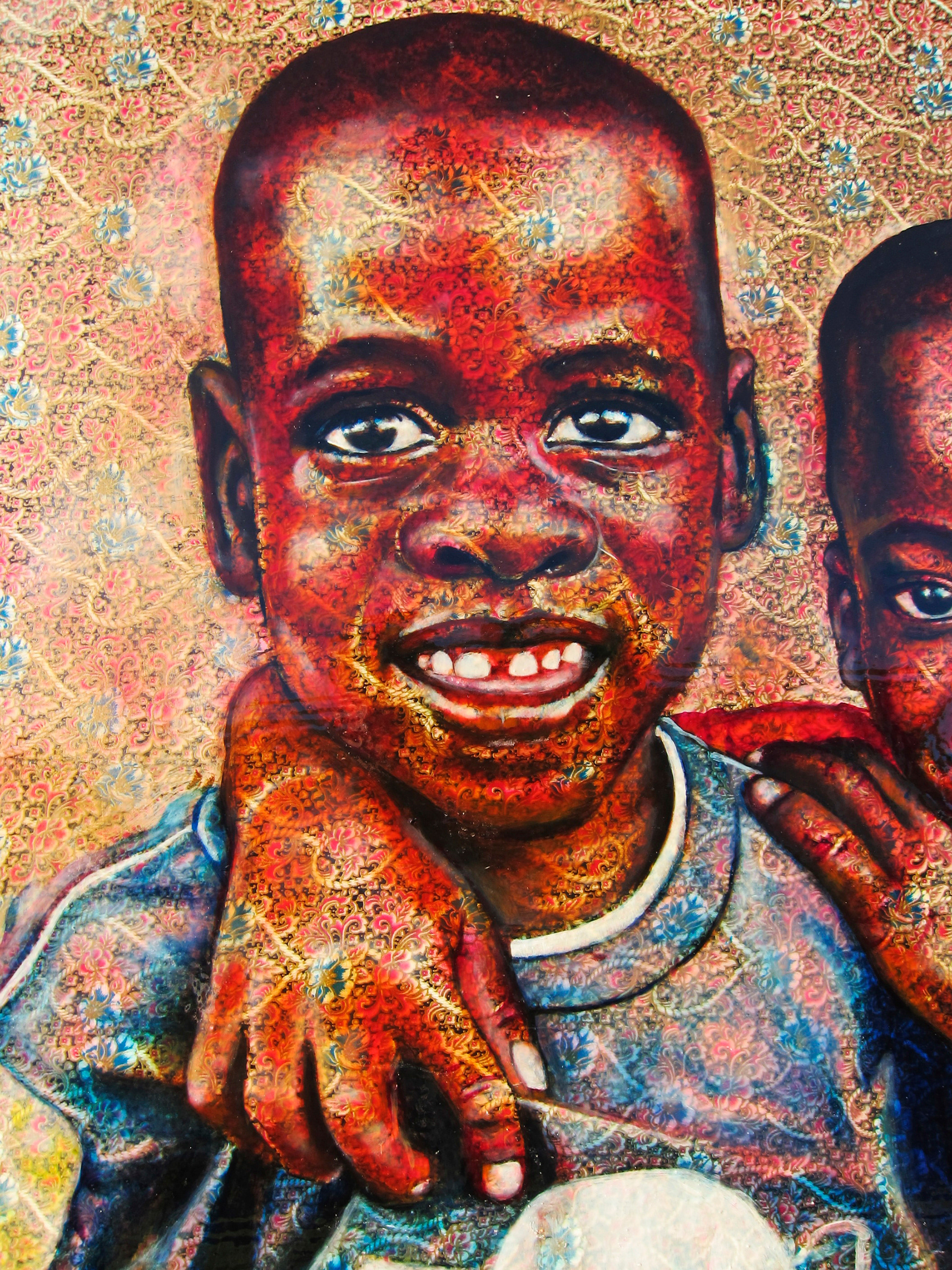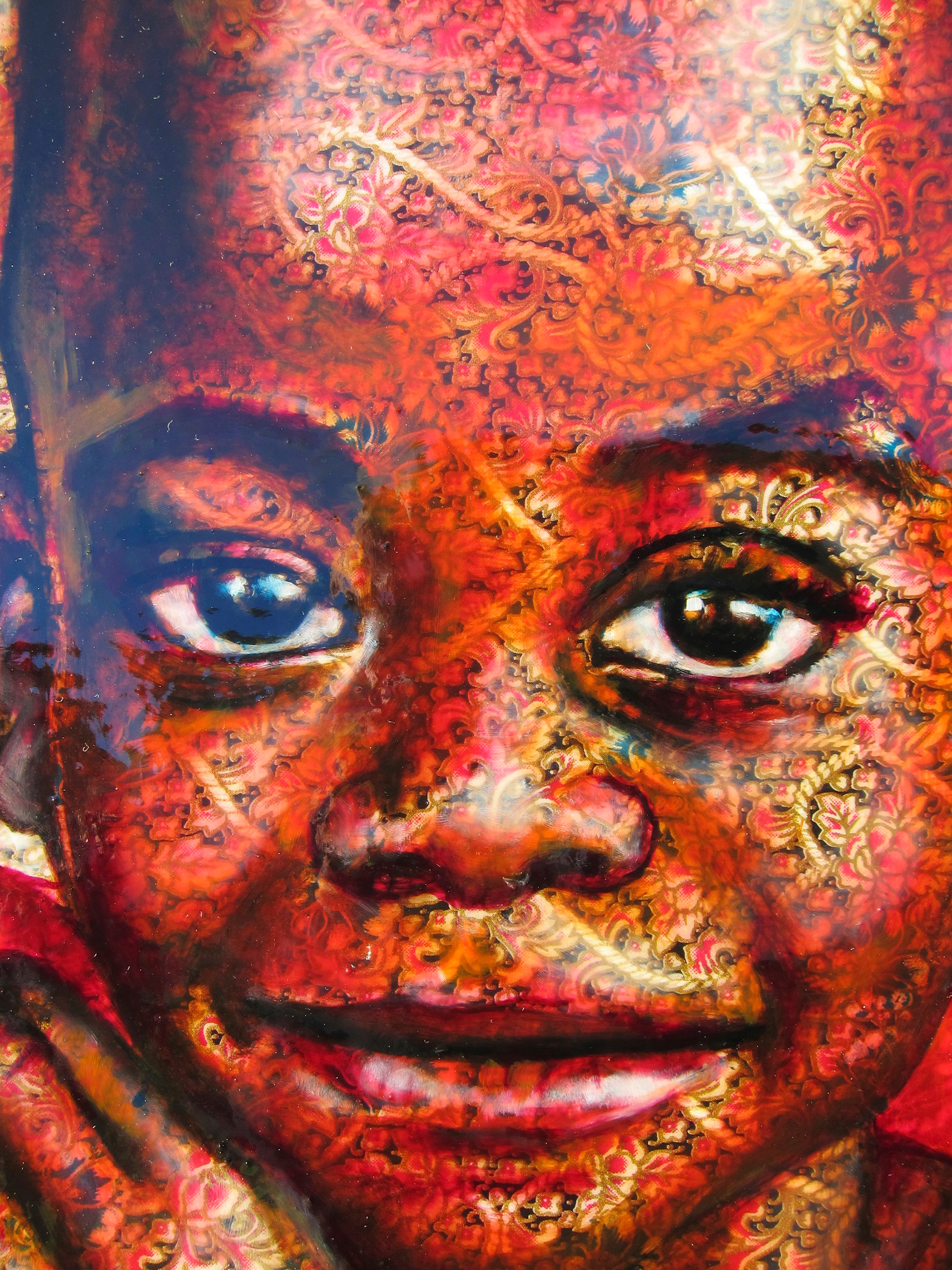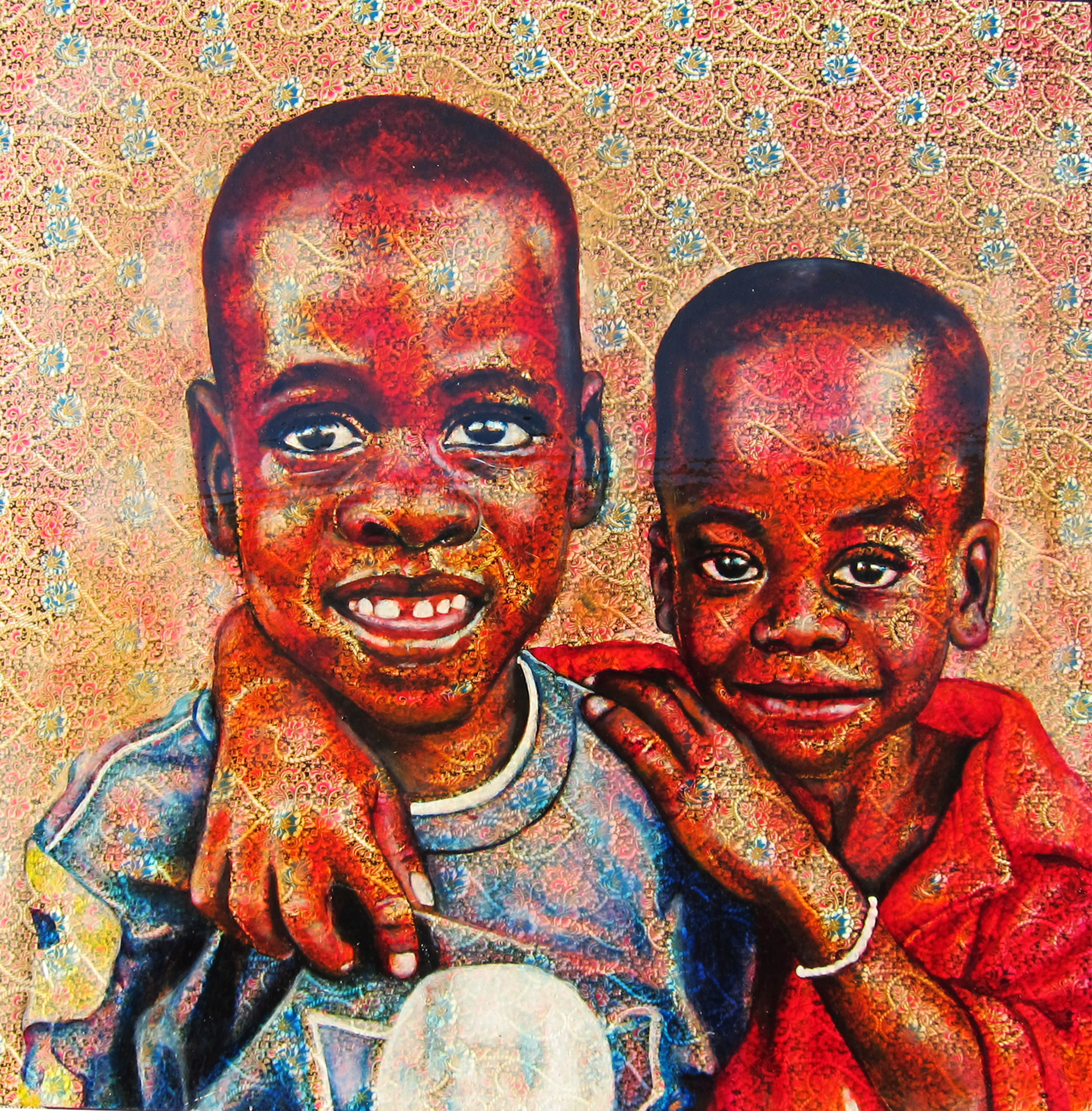 Oil on kitenge (African fabric) on woodpanel. 36" x 36" Sold